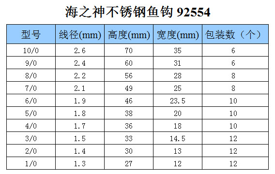 本淘寶店鋪是工廠直營店,所有不銹鋼魚鉤為本廠自產(chǎn)自銷,公司著力致力于不銹鋼海釣魚鉤、海釣路亞魚餌,不銹鋼材質(zhì)全部采用進(jìn)口不銹鋼為原料,經(jīng)特殊淬火工藝,再經(jīng)特殊表面處理,所有的不銹鋼魚鉤強(qiáng)度比高碳鋼高,表面達(dá)到鏡面效果,下海水2500小時(shí)不會上銹,還可以為客戶來樣來圖定做。